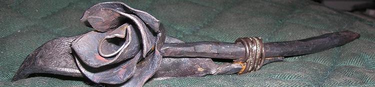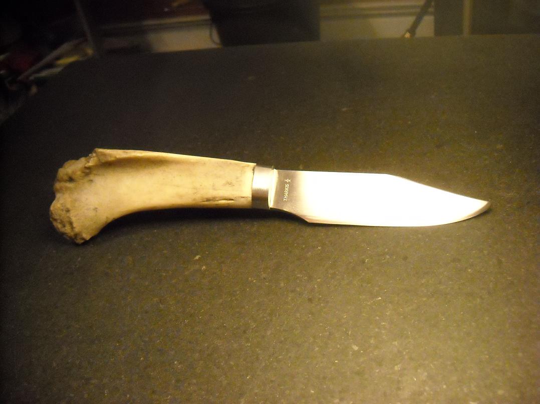 "left handed" 1084 clip point, wrought iron bolster, bear thigh-bone handle