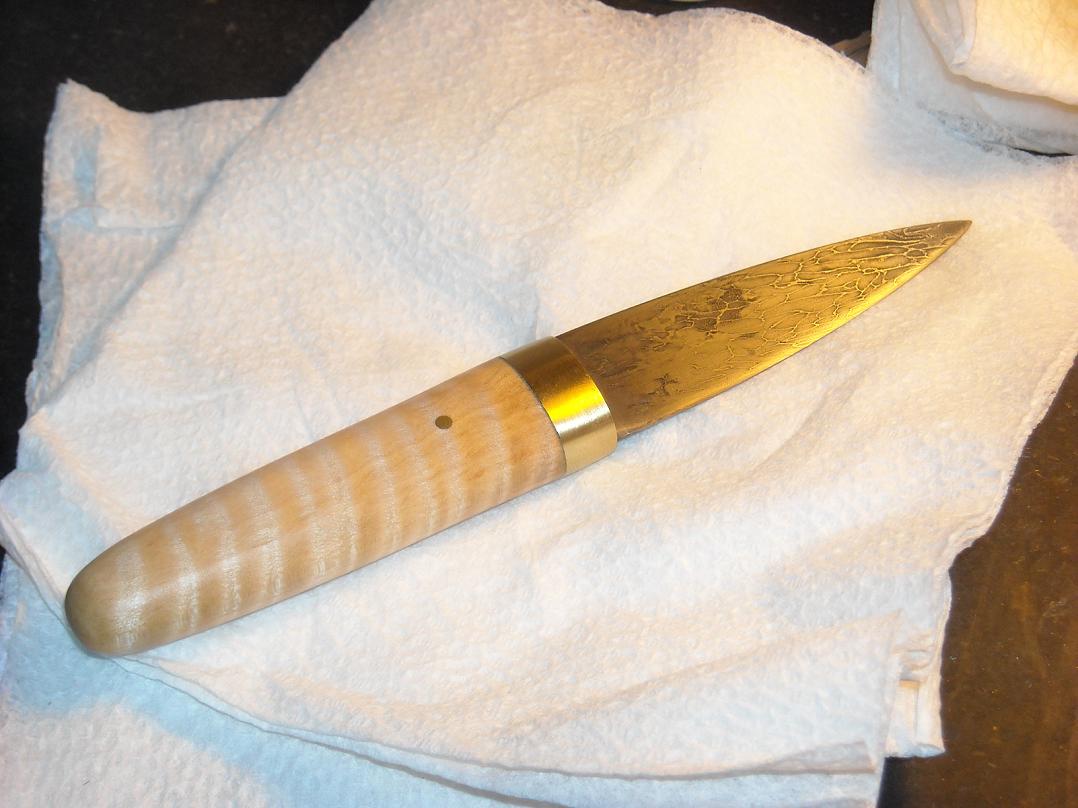 Forged O1 integral hunter with a leather spacer and quilted sycamore handle. Three inch blade, overal length 7.5 inches